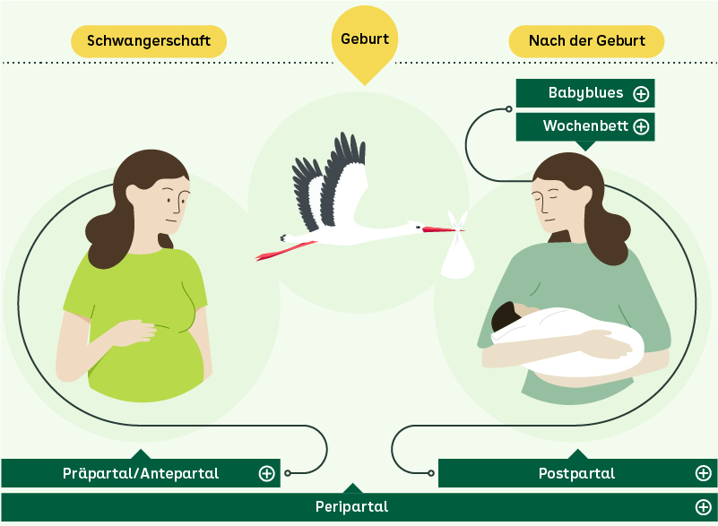 Wenn Ihre Angehörige unter depressiven Verstimmungen im Rahmen der Geburt eines Kindes leidet, ist es wichtig, einige Begriffe zu kennen. Klicken Sie in der Grafik einfach die + Symbole an, um zu erfahren, was sich hinter den Begriffen verbirgt.