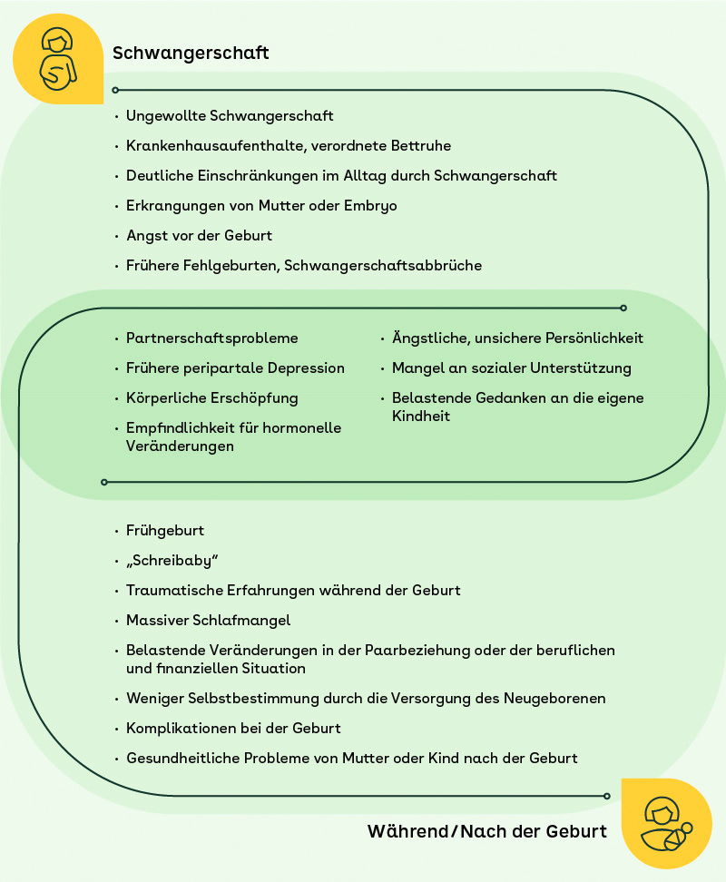 Zusätzlich gibt es besondere Einflüsse, die rund um die Schwangerschaft und Geburt die Wahrscheinlichkeit erhöhen, an einer peripartalen Depression zu erkranken (s. Abbildung unten). Auch Männer können von diesen Risikofaktoren, teilweise direkt (z. B. Partnerschaftsprobleme) oder indirekt (z. B. Angst um Mutter und Kind bei gesundheitlichen Problemen) betroffen sein.